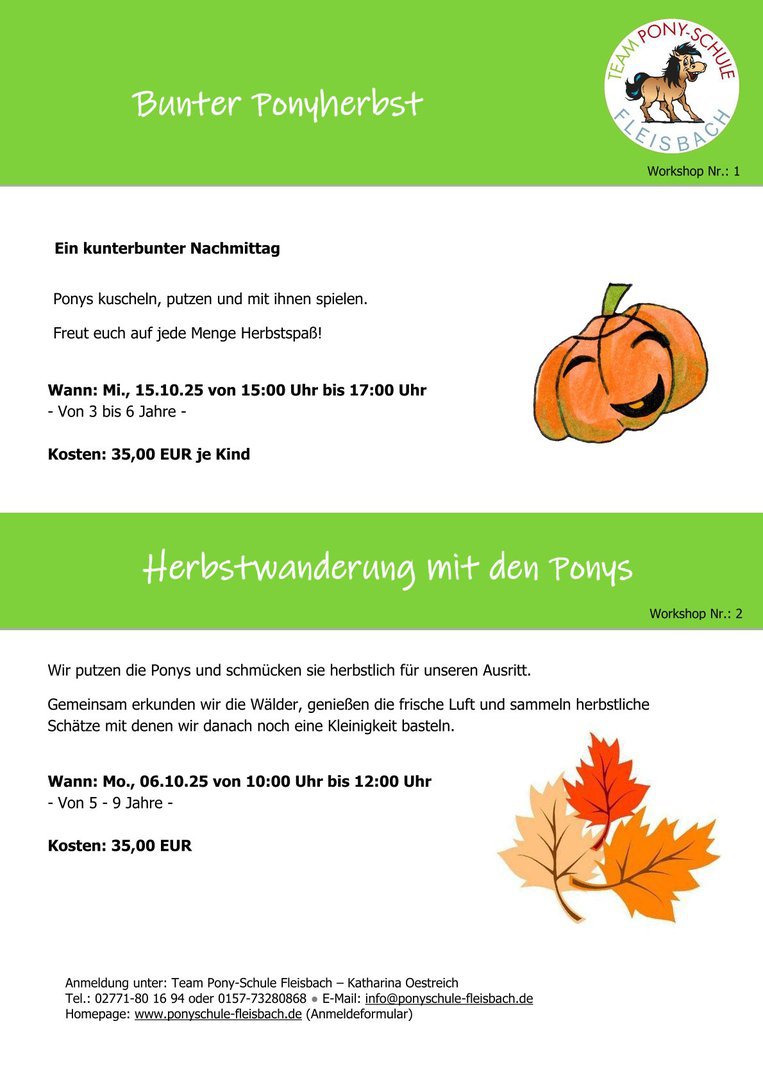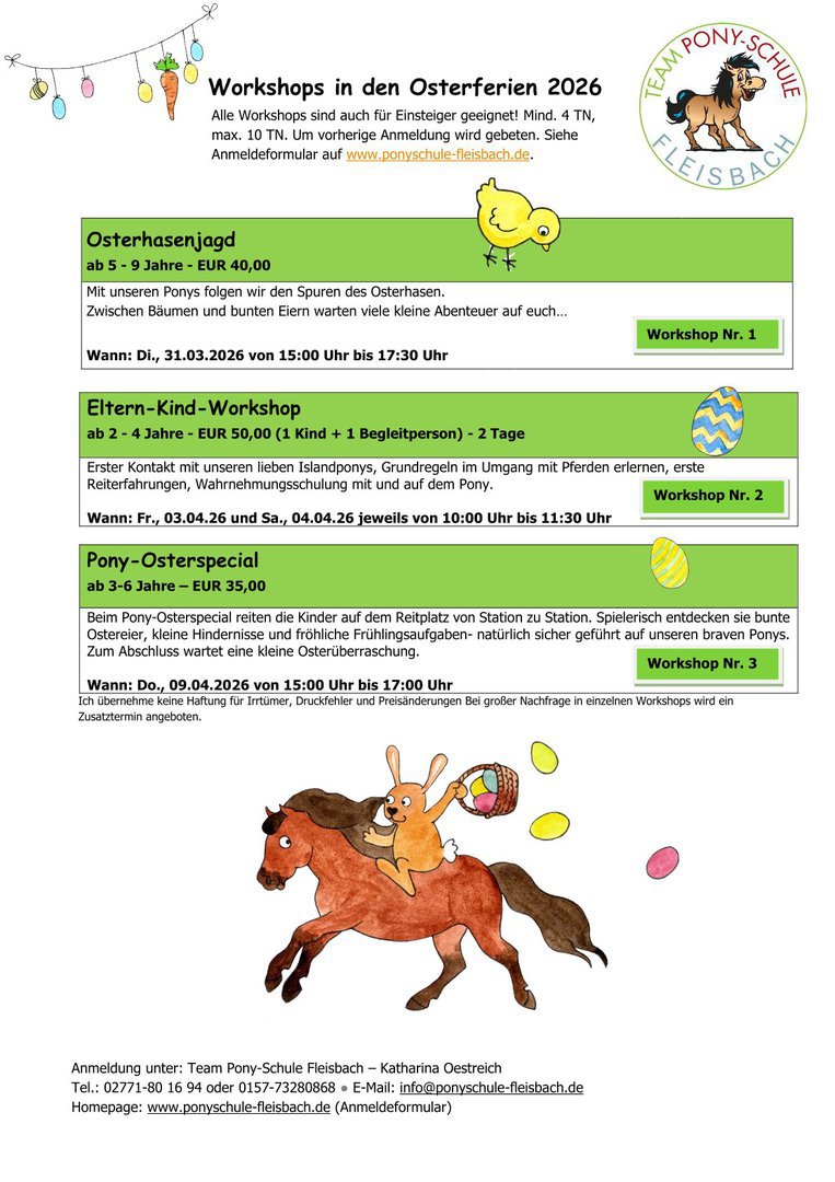 Wir bieten Workshops zu unterschiedlichsten Themen an. Diese "Highlights" bieten sich besonders gut für interessierte Kinder zum Reinschnuppern in die Ponyschule an, aber auch Kinder, die regelmäßig kommen, werden immer wieder mit neuen Ideen überrascht.